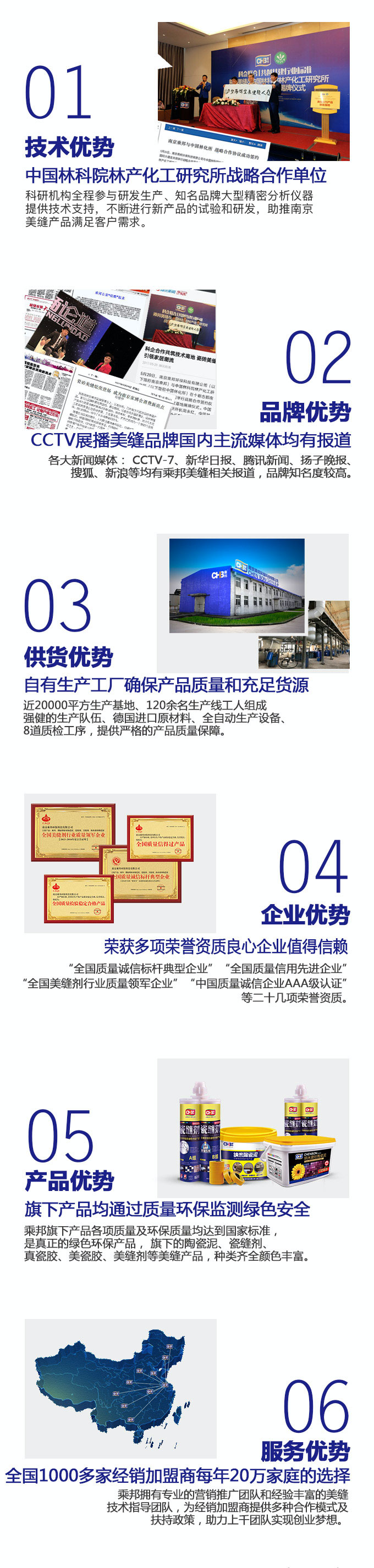 南京乘邦環??萍加邢薰境闪⒂?005年,是集南京瓷磚美縫南京美縫施工、美縫劑產品的研發與銷&售等產業的南京瓷磚美縫公司。目前公司主打美縫產品為國內推出的傳統美縫劑升級產品:乘邦納米陶瓷泥、水性環氧彩砂,天然砂質顏料,化妝品般安全無污染。乘邦陶瓷泥顏色豐富,大大提升裝飾效果,打造魔幻家居,讓家也可以炫酷起來。它綠色環保防霉防污,堅硬如瓷細膩光潔,不僅做到瓷磚縫隙“不變黑”,而且在為每一個家庭健康美麗而努力,這是乘邦公司的最高準則,也是乘邦人為之努力奮斗的目標,以此目標乘邦本著"誠信、合作、專業、超越"的理念,詮釋優質服務,演繹品質生活。同時公司擁有一支管理完善、經驗豐富的專業美縫施工隊伍。在南京瓷磚美縫價格方面也有很大的優勢,每年為南京近萬家庭提供美縫服務,其自主研發的乘邦牌產品在10余省市已有近千個代理商,在全國范圍內享有很高的知名度。